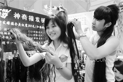 远赴云南苗寨,花1万元买来苗寨一位19岁美女1.5米长的黑亮头发,做自己店内的镇店之宝。昨日,万达商业广场内一家接发店的老板付超,得意地向记者展示这缕高价青丝。