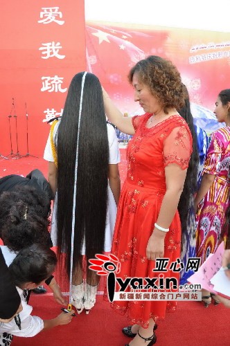 疏勒县举行维吾尔族姑娘长发比赛,工作人员正在仔细查看参赛选手们的发质和测量头发的长度。