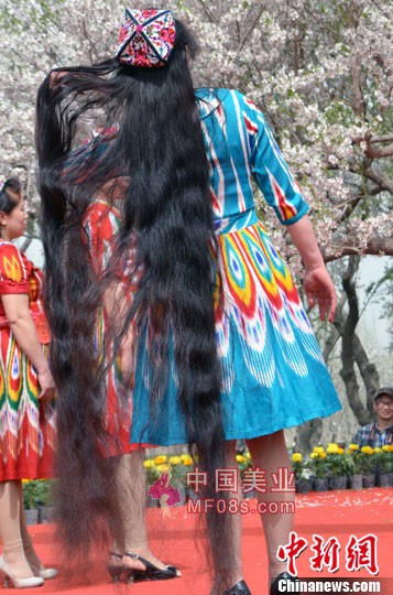 新疆莎车县举办第四届“魅力莎车采风暨巴旦姆花节”当地女性展示如瀑长发(2)