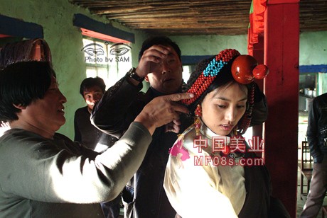 吃饱后继续工作,两个康巴汉子给旺姆拉整理头饰。