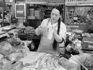 16日上午,记者来到白山市红旗贸易城,不需要打听就很容易找到正在给顾客割猪肉称重量的赵淑英,因为贸易城生肉摊床业户中,只有她一个人梳着长长的大辫子。