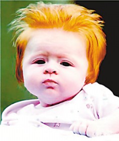 一名女婴成为眼下英国最引人注目的女孩,不是因为她比别的女孩更可爱,主要是因为她天生一头红发,而且发型酷似美国已故摇滚乐偶像“猫王”。这名女孩名为凯帝·李(如图),刚出生10个星期,她的头发长度已经是普通婴儿的7倍。英国《每日邮报》网络版6日……(2007-09-11)