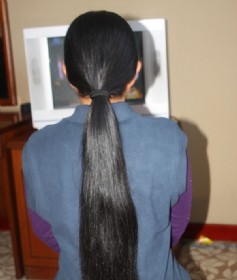 27岁女子,非常朴实,穿着朴素,话不多。头发乌黑,发量很多,上下均匀,编着辫子拿在手里沉甸甸的,剪下粗壮马尾65cm。喜欢粗马尾的请联系:13135043344,QQ:1254360632(注明粗马尾),非诚勿扰。