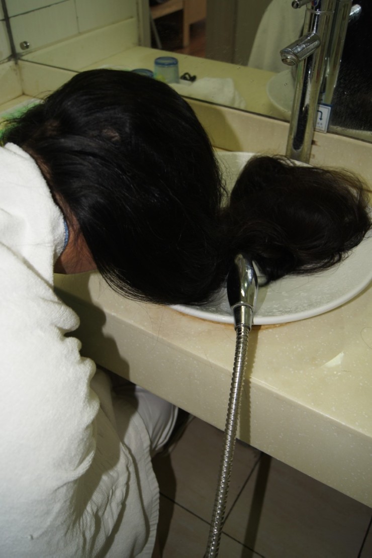 心急母亲拍长发女儿洗澡