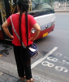抓拍公交站旁的双辫女
