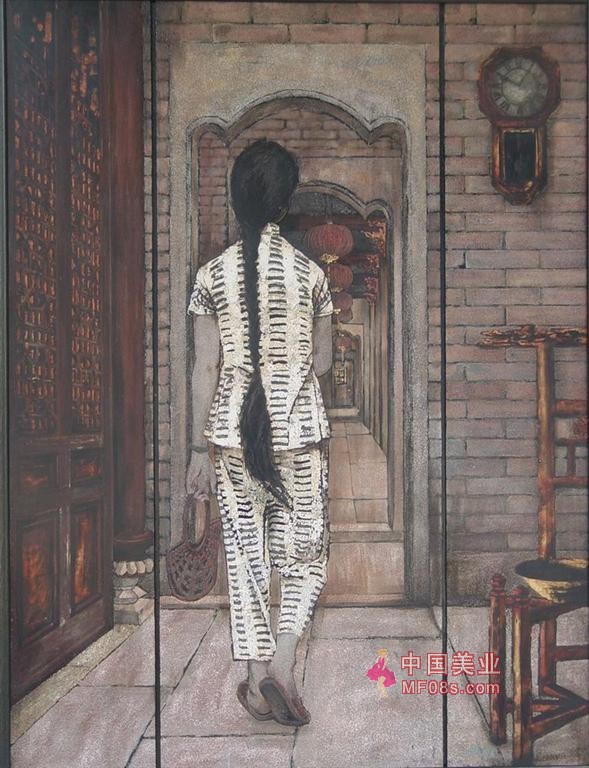 以荔湾区博物馆为背景,大辫子姑娘走进屋内,画作应用了肌理的表现手法,呈现出栩栩如生的立体效果。