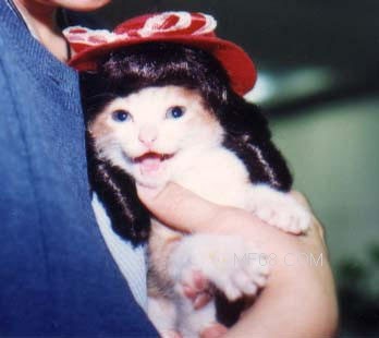 搞怪示范:此猫戴的这款假发俗称“罗马卷”,如果逛假发店,你也不妨要求试试看,效果很“大小姐”哦。
