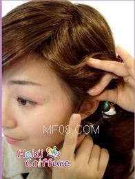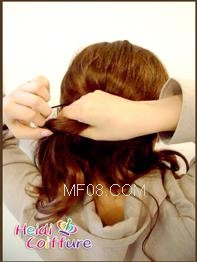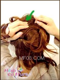 要点:一定要抓松松地束,让头发跟假发的发网相接的地方隐藏地不露痕迹