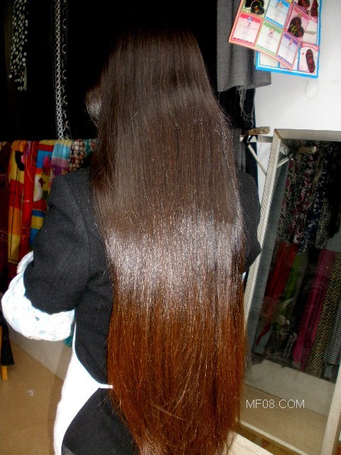 她是裁衣的老板娘,由于生意较忙,无时间去打理长长的头发,女儿也劝说妈妈去把头发剪了.如需购买者,请联糸我,电话:15984659604, QQ:1084650359@QQ.com. 价高者得,本张图片是没洗前拍摄的.她本人说洗后便柔顺闪亮,不诚勿扰.