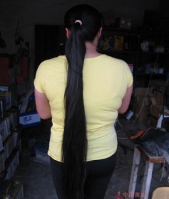 这位长发妹妹的长发发量实在太多,橡皮筋扎断两根,只好用一根粗绳子扎紧,可剪长度为90厘米,分两根辫子剪下,发质很不错,没有污染过,原生态的,有意者请联系15005596416,非诚勿扰。特别说明:受妹妹委托,她希望能够拍卖此发.……(2014-04-12)