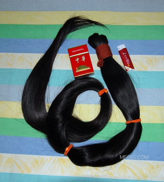 近日我在山东烟台有幸得到一根长发,长度是150厘米,重量是620克,发质细柔,微黑色。希望大家喜欢喔。其中有一根从湖南岳阳收藏的辫子与这根大粗辫子比较