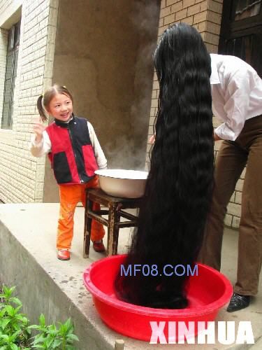 7月10日,江西长发女夏爱风准备洗头发。今年33岁的夏爱风是江西上饶市荣利达房产代理有限公司职员,她从20岁开始不剪头发。现在,身高只有1.60米的她已留下1.92米的长发,是至今已知晓的江西头发最长的人。她每个星期洗一次头,每次需90分钟。夏爱风表示要将头发留到2008年奥运会举办时。