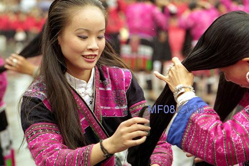 红瑶妇女不会将头发随便剪下扔掉。即使平时梳脱的头发,也要一根根聚起,慢慢捆扎成束。红瑶女的头发大多在一米以上,最长的达到1.75米。如当了妈妈,头发实在不够长,不足以束成发髻,就将平时聚集成束的头发也接上去,形成红瑶嫂的标志。现在洗发护发用品广告充满电视,红瑶女在未与外界沟通的年代,不可能用什么洗发精之类。是什么为她们养护一头秀发?其实很简单——淘米水。也就是用大米做饭时的洗米水,把它留下,用于洗发,竟起到生发护发的作用,并无其他秘方。