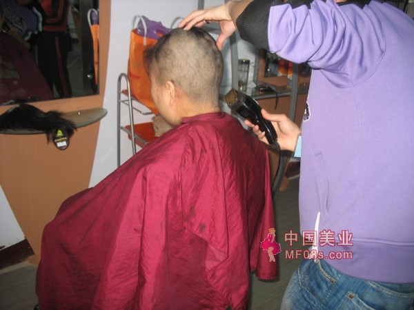 顿时锋利的刀刃割断黝黑的长发,露出青色的头皮,薇薇不由得叫出声了,伸手摸了摸有些扎手的后脑,突然有种想哭的感觉。”先摸到这,等会还要刮一遍呢!”林音说着拿开薇薇的手,拿起一缕长发,又推了上去,薇薇无奈地闭上眼睛感受着那犹如磁疗般地震动以及震动过后松弛的皮肤,心中暗暗祈祷林音不要剪太难看了,经过一阵身心的煎熬,薇薇开始喜欢上这种舒服的震动,当林音放下推剃时,薇薇朗声说道”小音能不能推再高点!”林音会意笑了笑重新拿起嗡嗡的电剃,一阵嗡嗡声后,黑色的发丝落在薇薇白皙的大腿根部,将那性感的蕾丝内裤完全遮挡,小巧的耳朵也重新露出来,林音涂上泡沫,在光秃秃的头皮上来回刮了3次,将头皮刮得有些微红,薇薇在剃得光滑后脑来回抚摸,毅然有种舍不得放手的感觉,林音掩嘴一笑,拍了拍薇薇的手背轻声道”快好了,等会再摸啦!”薇薇不好意思的抽回手,林音解下头顶的长发,拿起剪刀来回晃悠一阵,抓起头发剪了起来。林音剪刀一停,薇薇迫不及待地重向浴室,看着镜中的 自己,薇薇的表情如同林音看到自己眉毛消失那样的愕然,黑色的头发犹如一口小黑锅般罩在林音头上,将剃得光秃秃的后脑勺完全的暴露在外面,薇薇看着自己可爱中带着傻气的发型,无奈的摇了摇着头。