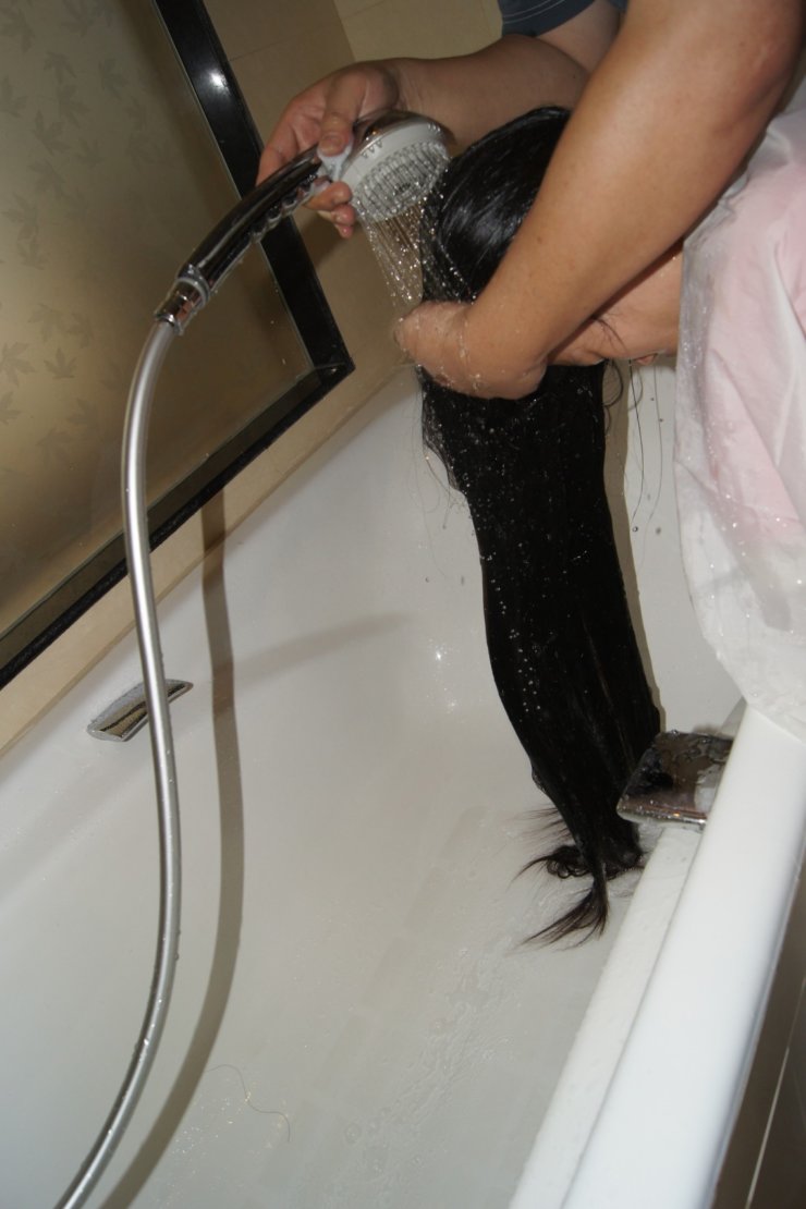 心急母亲拍长发女儿洗澡