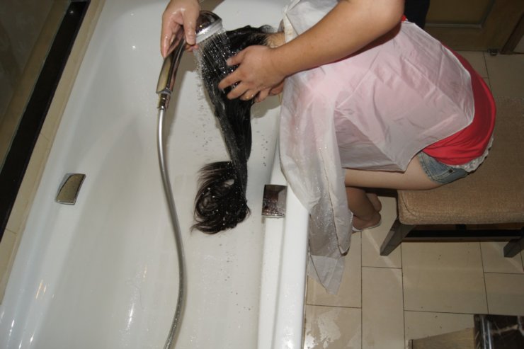 心急母亲拍长发女儿洗澡