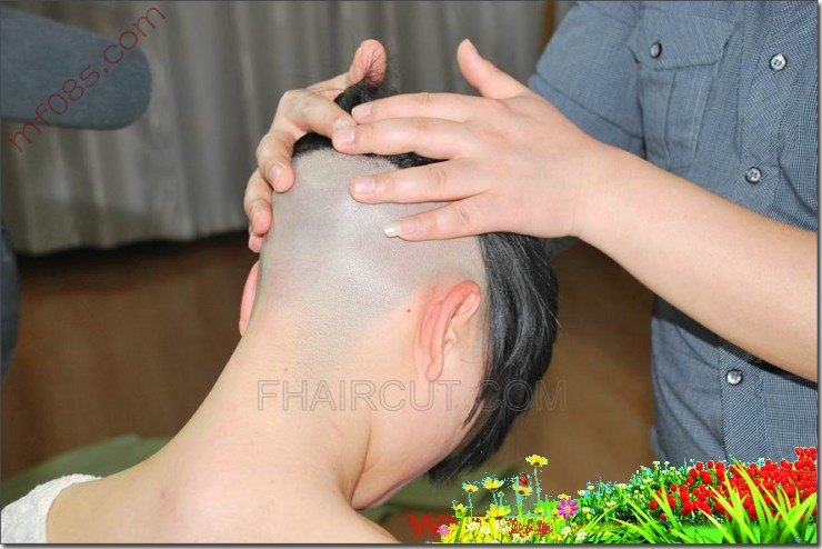 这时阿姨把小琪的头都夹到了头顶上,拿出剃须膏,涂在小琪的脑后和两边的鬓角上,涂出了好多的泡沫,阿姨拿起银白色的剃刀,按低了小琪的头,莎莎莎的刮了起来,一刀剃过去,小琪脑后出现了一块白色的头皮,白色的泡沫刮到了剃刀上,阿姨擦掉泡沫,又刮了起来,剃刀一刀一刀的刮着,脑后白色的头皮也越来越多,脑后很快就刮的光光的了,阿姨把小琪的鬓角也刮光了,