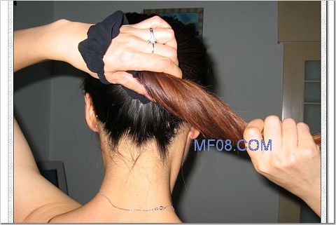 第一步:又是马尾法出场,嘻嘻,梳马尾,第二步把发圈在头发上饶两圈,第三圈暂时不饶,套在手上,等最后盘好头发再出场,用手拉住马尾扭紧