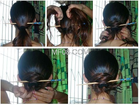 2、分开两股头发 向上围着簪子交错环绕.